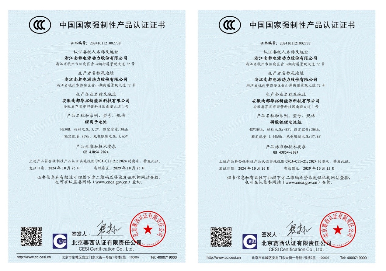 In proactive compliance with regulatory requirements, Narada Power has enhanced key indicators such as battery safety, energy density, cycle life, and environmental adaptability, achieving the GB 43854 national mandatory standard and applying for CCC certification for its products.